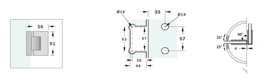 Glass to Glass 90° | Frameless Shower Hinge | Satin Nickel Glass-to-glass 90° swing shower door hinge has a load capacity of 35 kg. Designed for mounting doors to a fixed sidelight, it supports glass panels up to 0.75 x 2.10 m. The hinge is suitable for frameless shower enclosures...