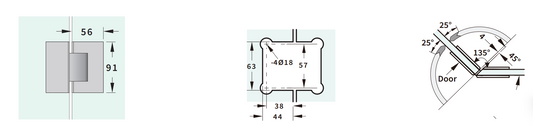 Glass to Glass 135° | Frameless Shower Hinge | Polished Chrome Glass-to-glass 135° swing shower door hinge has a load capacity of 35 kg. Designed for mounting doors to a fixed sidelight, it supports glass panels up to 0.75 x 2.10 m. The hinge ensures smooth operation with self-centering functionality...