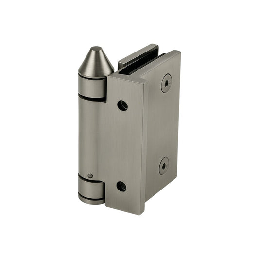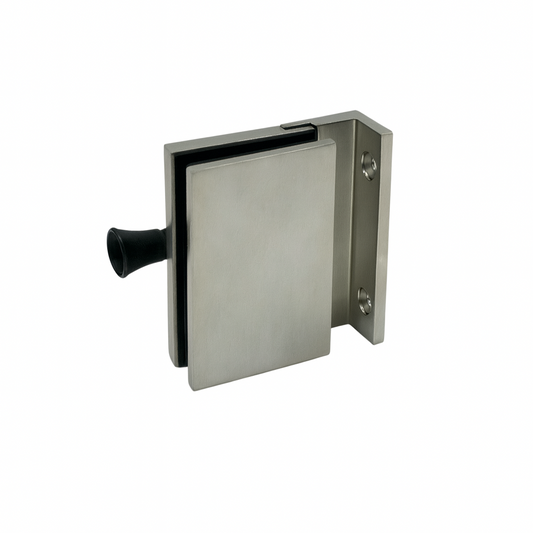 Post Pool Hinge | Satin Nickel Adjustable wall/post pool gate hinge (Left) made of durable stainless steel with a satin nickel finish, designed for mounting 10 mm tempered glass panels. Features on-site alignment through an adjustable hinge body and includes a black rubber gasket with M6×50 mm screws. Supplied as...
