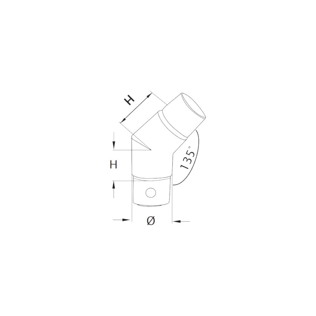 Satin Nickel 135° Tube Connector, compatible with 42.4 mm (Grade 304 – indoor) or 48.3 mm (Grade 316 – outdoor) tubes.