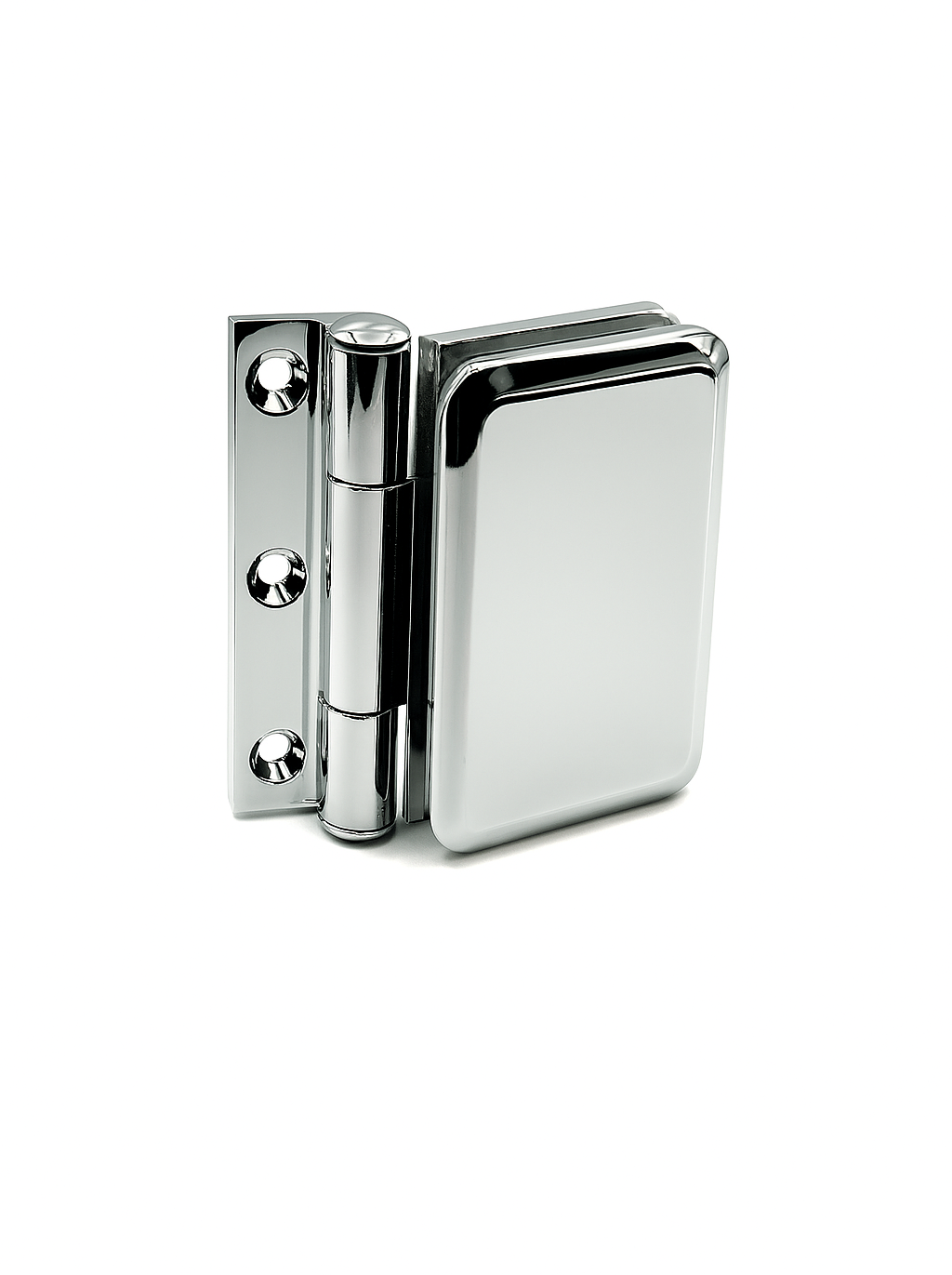 Wall-to-Glass 90° Shower Hinge — Polished Chrome A durable brass hinge designed for 6–10 mm glass doors up to 45 kg, featuring a 90° opening angle and supplied as a single hinge per package.