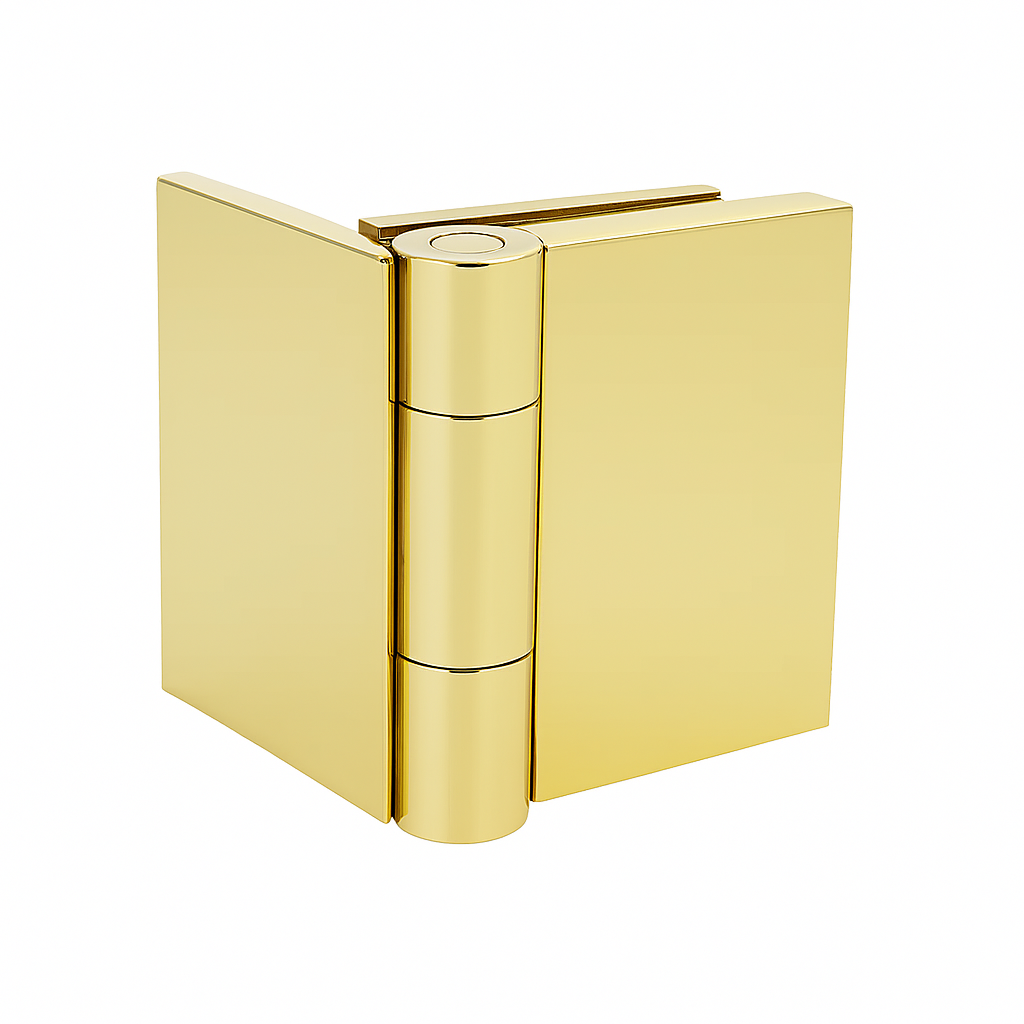 Wall-to-Glass 90° Shower Hinge — Polished Gold A durable solid brass 90° hinge for mounting a shower door to a wall or fixed panel, compatible with 6–10 mm tempered glass doors up to 45 kg, and supplied individually as a single hinge per package.