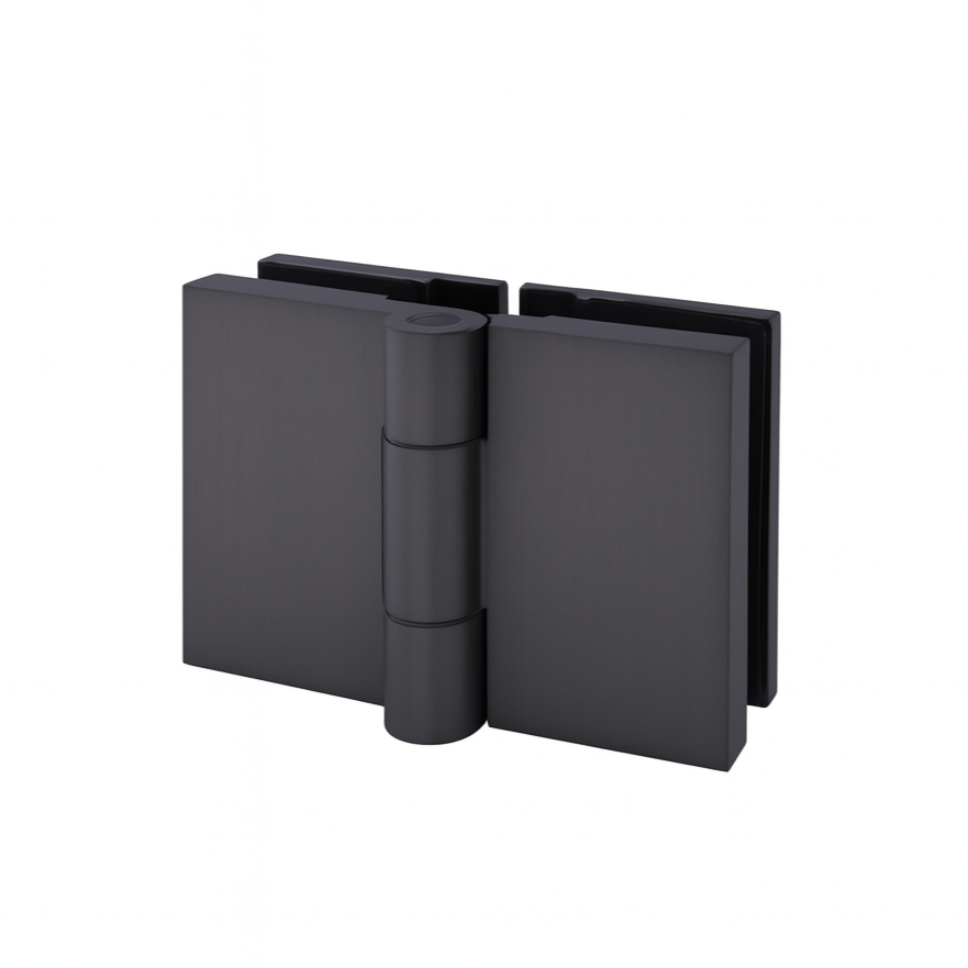 Glass-to-Glass 180° Shower Hinge — Gun Metal A solid brass 180° swing hinge for mounting a shower door to a fixed sidelight, suitable for 6–10 mm glass doors up to 45 kg and supplied individually as a single hinge per package.
