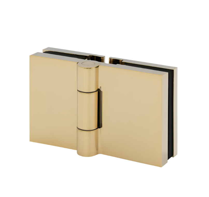 Glass-to-Glass 180° Shower Hinge — Polished Gold A solid brass 180° swing hinge for mounting a shower door to a fixed sidelight, suitable for 6–10 mm glass doors up to 45 kg and supplied individually as a single hinge per package.