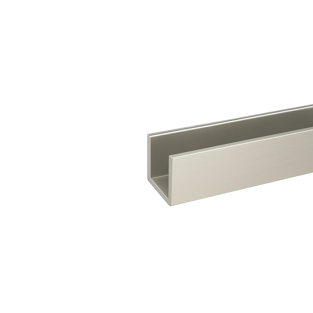 A slim aluminum U-channel supplied in a single 2500 mm length is designed for securing fixed 10 mm glass panels and delivering a clean, modern look in wet areas and shower partitions.
