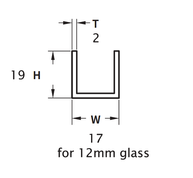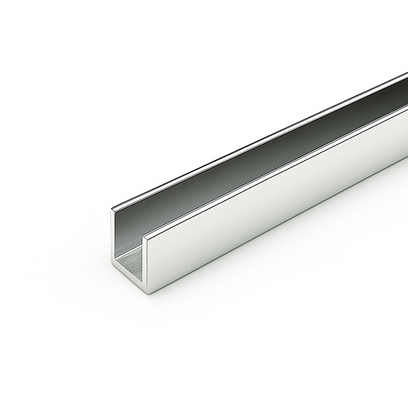 Slim aluminum U-channel for securing and framing 12 mm glass panels in shower enclosures. Supplied in a single 3.60 m length with a high-luster polished chrome finish.