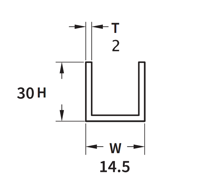 A slim U-channel with a compact 30 mm (H) × 14.5 mm (W) profile designed for securing and framing 10 mm glass panels, delivering clean and minimal sightlines in modern installations.