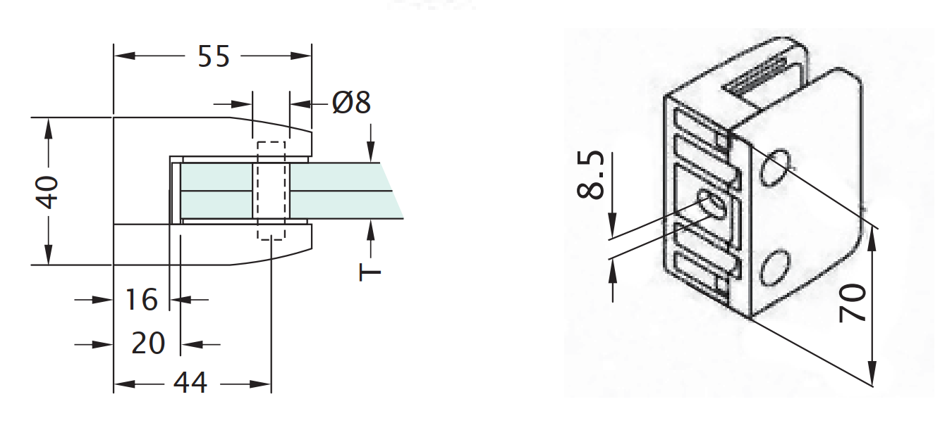 Heavy-duty square glass clamp, featuring a modern design for 13.5 – 17.5 – 21.5 mm glass thickness and measuring 70 × 55 mm overall.