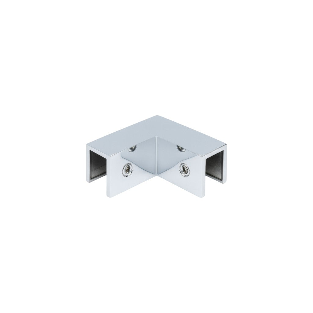 Polished Chrome corner glass connector with a square profile, made of durable stainless steel 304, designed as a 90° shelf bracket for supporting corner glass shelves or joining panels (suitable for 10–12 mm glass); includes one bracket per package.