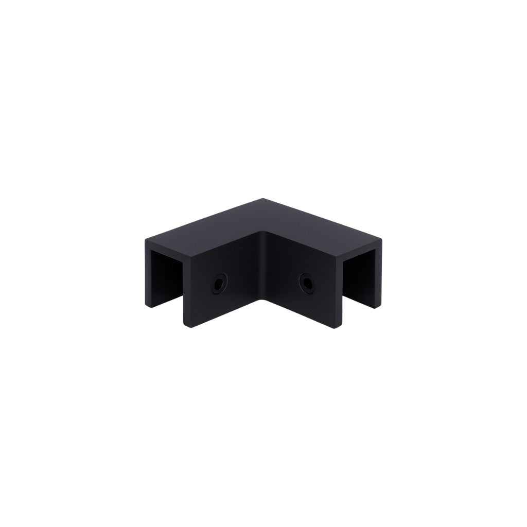 Matte Black corner glass connector with a square profile, made of durable stainless steel 304, designed as a 90° shelf bracket for supporting corner glass shelves or joining panels (suitable...