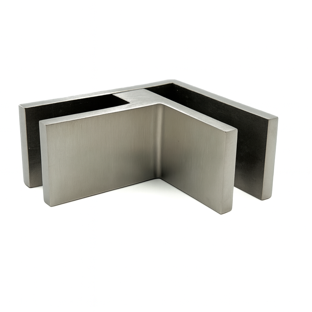 - 90° angled glass bracket for joining glass corner sections.- Glass thickness: 21.5mm - Stainless Steel 316- Finish: Satin Nickel