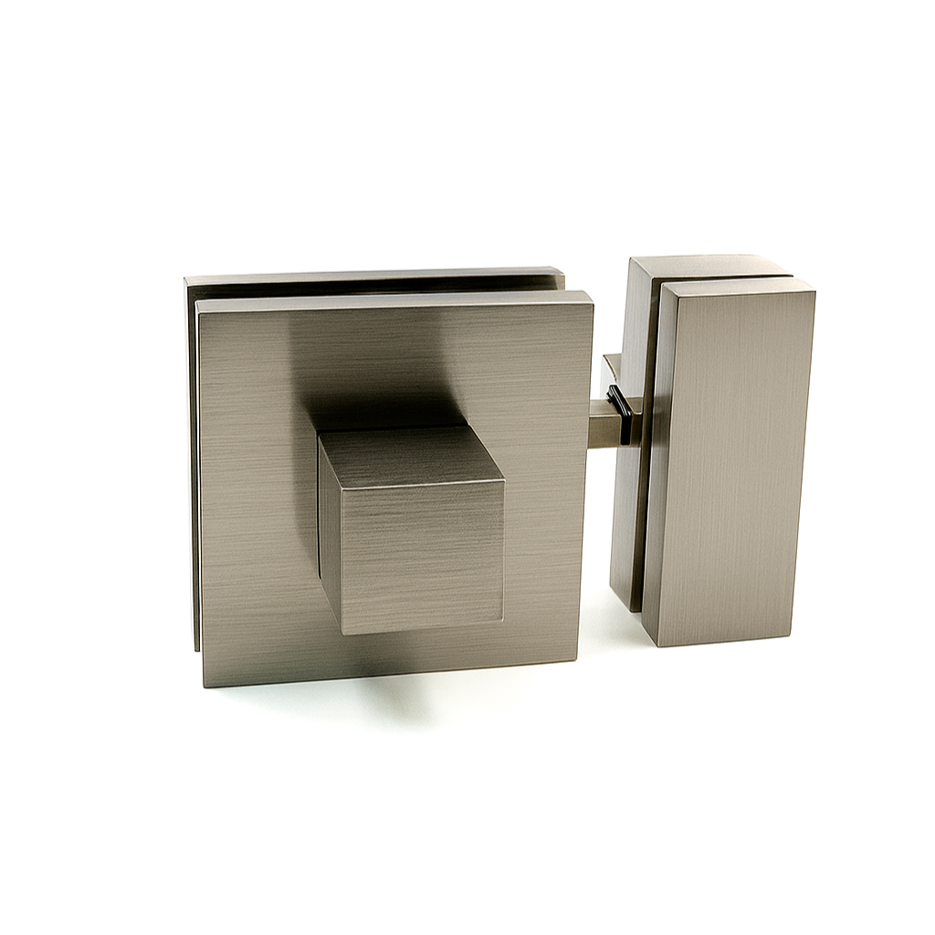 Modern square latch for frameless shower doors. Solid brass body with a bright satin finish; designed to secure 8–10 mm glass with a smooth latch action.