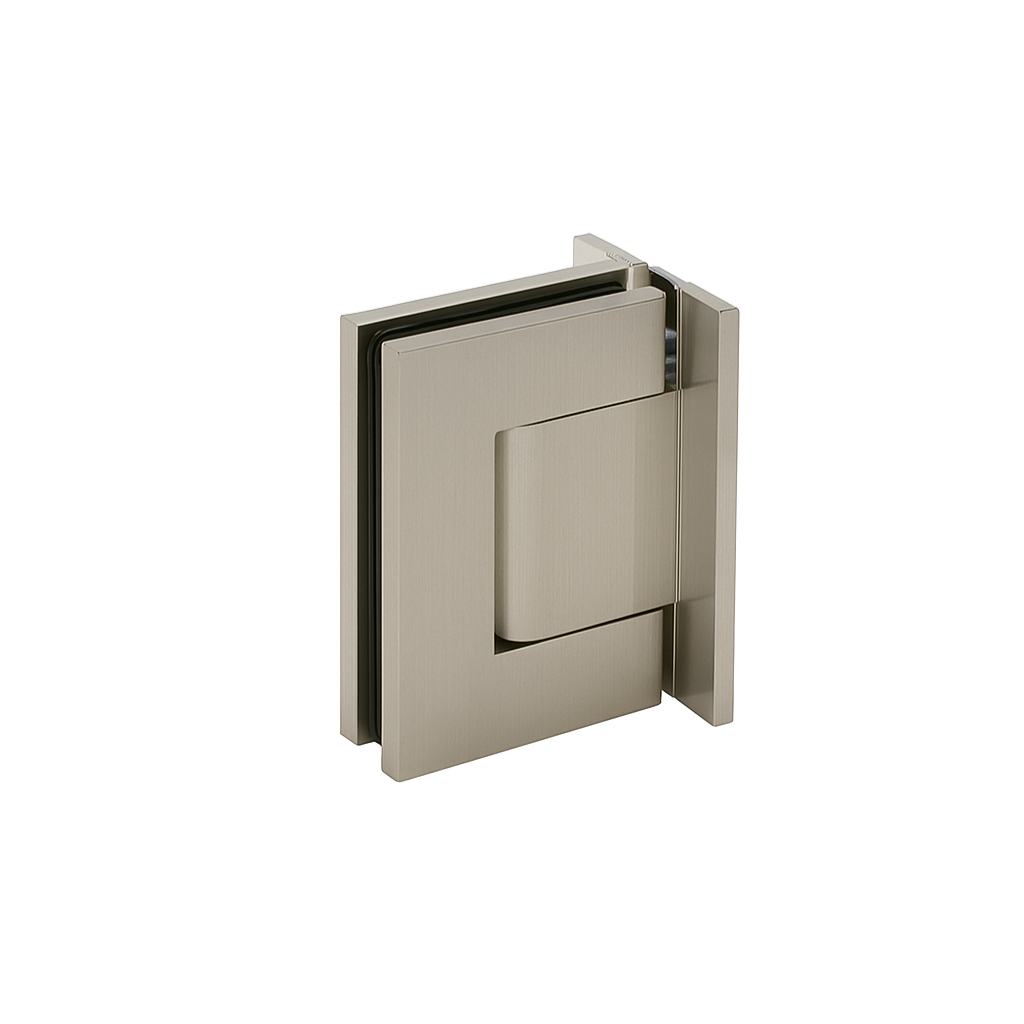 Hydraulic, self-closing hinge for frameless glass shower doors. Designed for smooth, controlled closing and a clean 90° wall-to-glass installation.