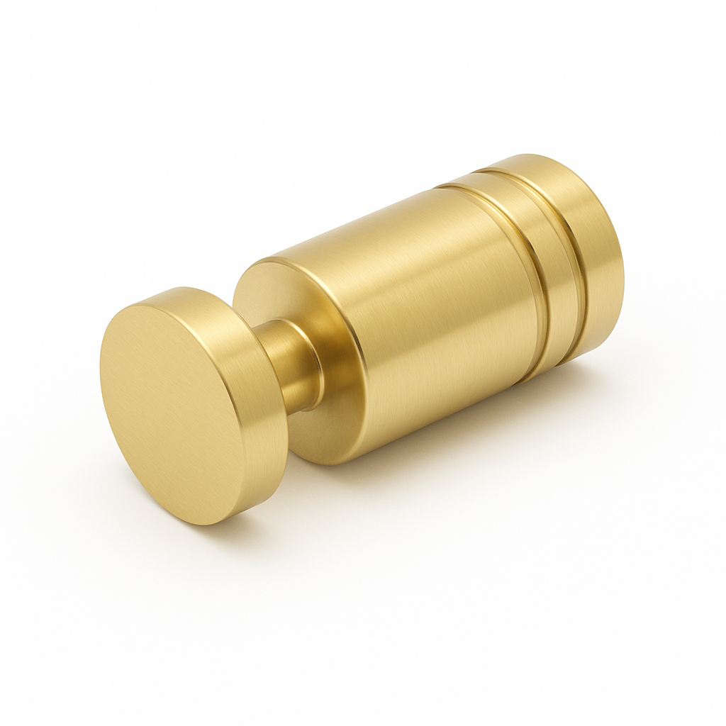 Single-sided pull knob for frameless glass doors. Solid brass with a refined Brushed Gold finish; fits 8–10 mm glass and installs through a single Ø12 mm hole.