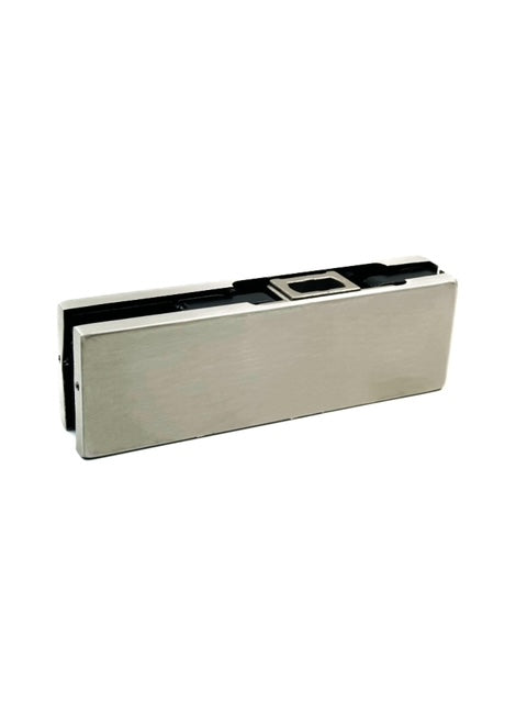 - Stainless steel door patch fitting for lower corners within a frameless glass door system