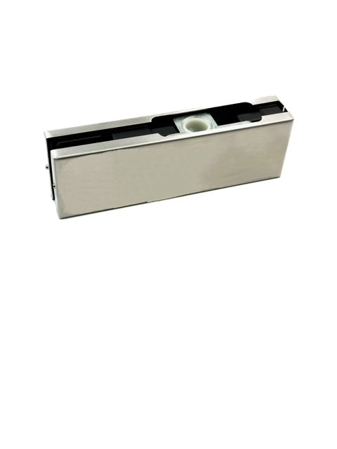 - Stainless steel door patch fitting for upper corners within a frameless glass door system.