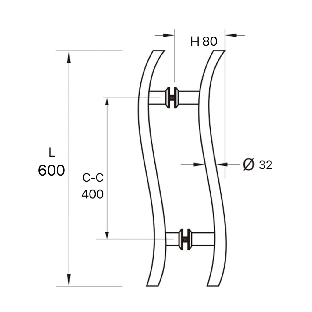 Stylish S-shaped back-to-back pull handle made of stainless steel with a satin nickel finish, featuring a 600 mm overall length, 400 mm center-to-center spacing, Ø32 mm tube diameter, and 80 mm projection.