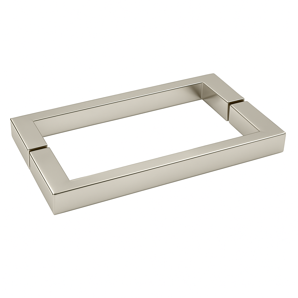 Modern square-profile pull handle with a smooth satin nickel finish. Designed for clean, through-bolt installation on glass or door panels.