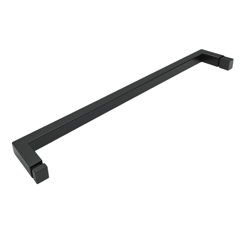 Square-profile towel bar paired with a matching knob for frameless shower doors. Designed for clean through-bolt installation.