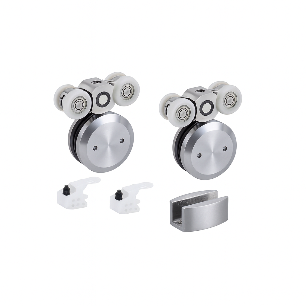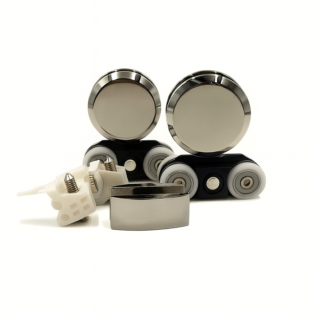 Pulley Sliding System | Polished Chrome | 8–12 mm Glass — High-quality sliding wheel set designed for frameless glass doors and panels, providing smooth and reliable operation. Suitable for 8–12 mm glass thickness with a sleek polished chrome finish, ideal for shower enclosures and interior glass partitions.