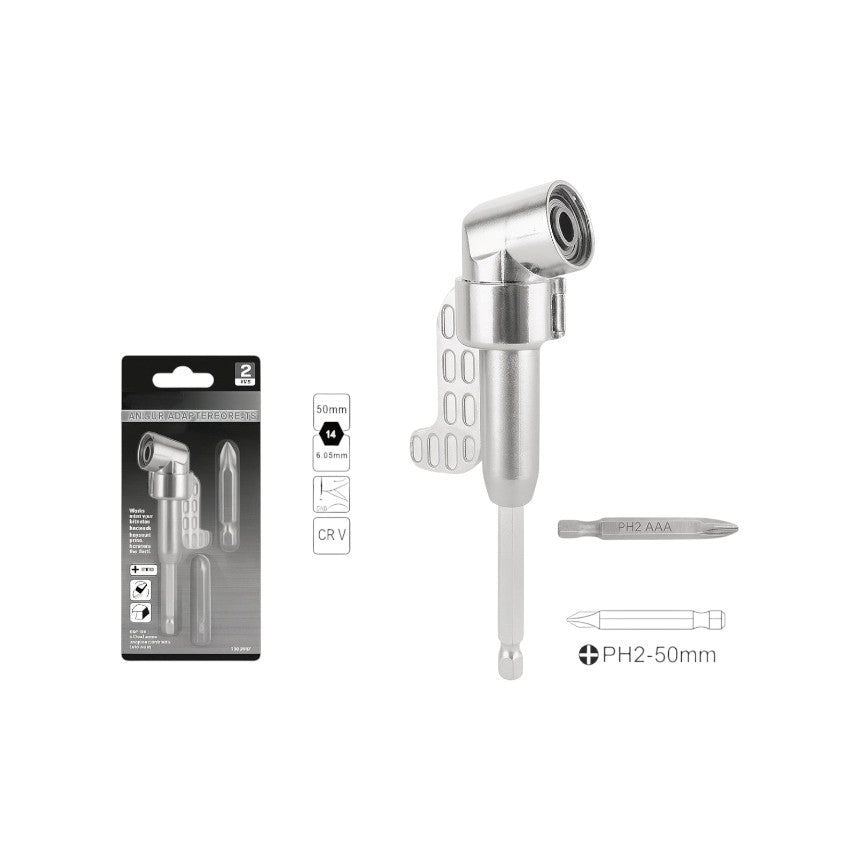 The Angle Adapter for Bits (105° Right Angle Drill Attachment) is made from durable CR-V steel and designed for drilling or driving in tight spaces where standard drills can’t reach. Featuring a magnetic 1/4" hex shank for secure bit holding and universal compatibility, it includes a 50 mm PH2 screwdriver bit for added versatility—perfect for woodworking, metal drilling, automotive repair, and DIY projects. (Pack includes 2 pieces: 1 angle adapter + 1 PH2 bit.)