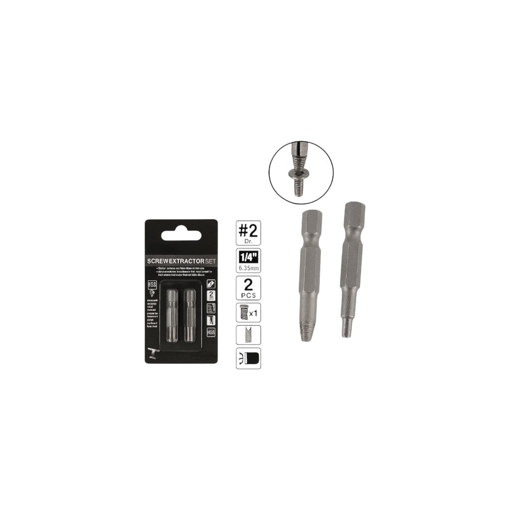 The Screw Extractor Set includes two double-ended HSS extractors (each approx. 50 mm long) with 1/4" (6.35 mm) hex shanks for quick-change drills, designed to remove stripped or broken screws and bolts cleanly using a simple two-step burnish-and-extract process for light metal and wood applications.