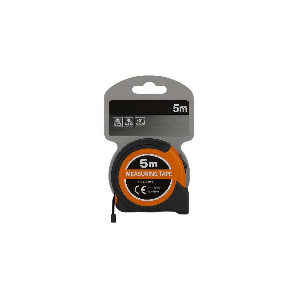 The Measuring Tape 5m × 19mm is a heavy-duty tape measure featuring a durable bi-material non-slip case, extra-wide concave blade for clear, accurate readings, and smooth recoil motion for safe retraction. Its double-riveted hook ensures precise internal and external measurements, making it ideal for construction, carpentry, woodworking, and DIY projects. (Pack includes 1 piece.)