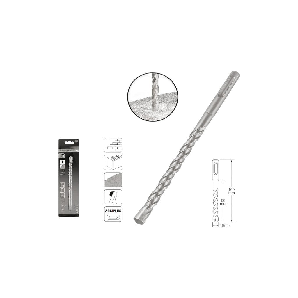 The Hammer Drill Bit Ø10 mm × 160 mm (3/8" × 6-5/16") features a super-hard carbide tip and SDS Plus shank for powerful, efficient drilling in concrete, masonry, brick, stone, and tile. With a 90 mm (3-1/2") flute length and shot-blast finish, it ensures fast penetration, superior durability, and long service life. (Pack includes 1 piece.)