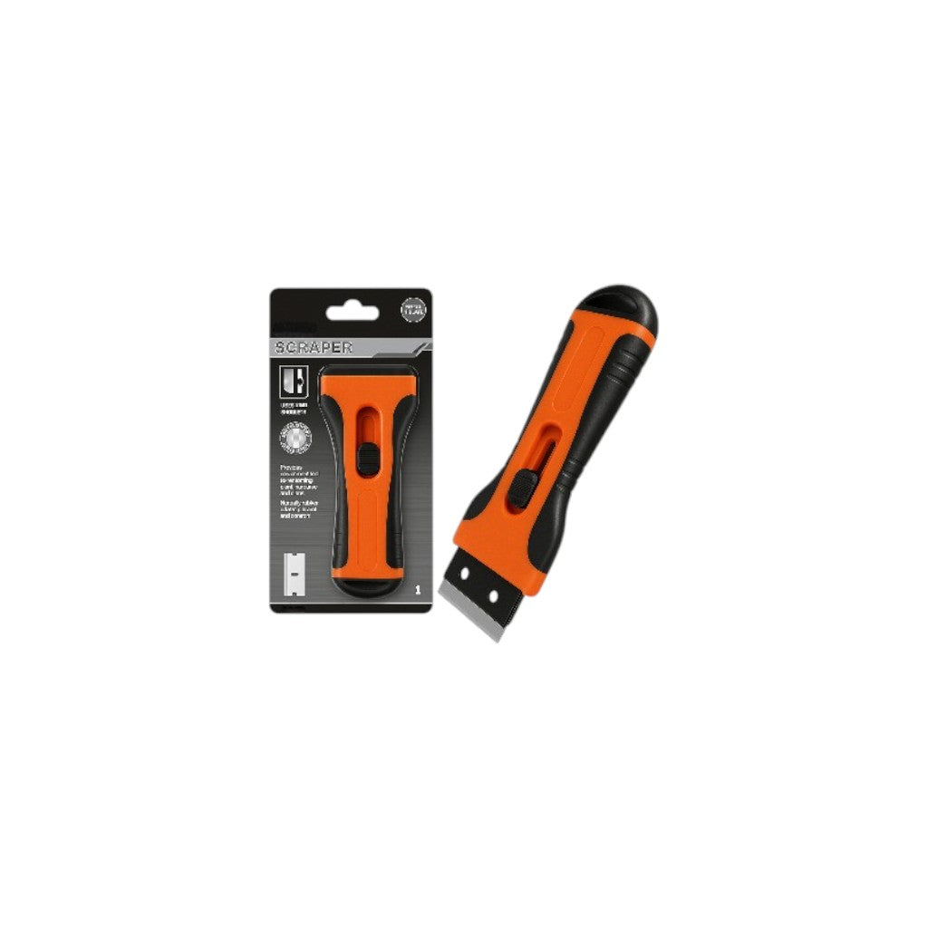 The Scraper is a versatile, ergonomic tool designed for safely and efficiently removing paint, stickers, adhesives, and more from glass, tiles, metal, and other smooth surfaces, featuring a locking retractable blade, durable non-slip handle, and easy blade replacement for precise, controlled use.