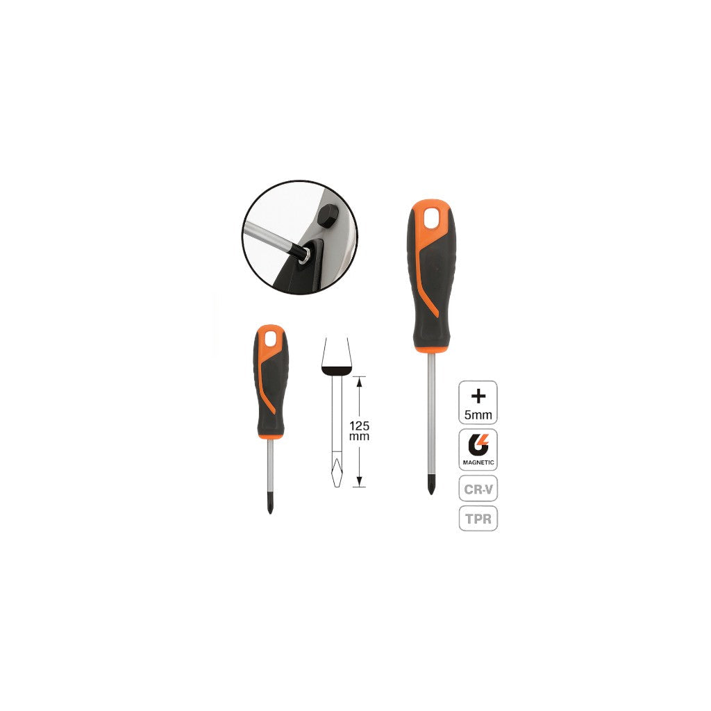 The Screwdriver (5×125 mm) is a precision-engineered tool made from hardened chrome vanadium steel (CR-V) with a chemically blacked magnetic tip for accuracy and secure fastening, featuring a non-slip TPR handle and solid steel core for strength, comfort, and reliable performance in heavy-duty applications.