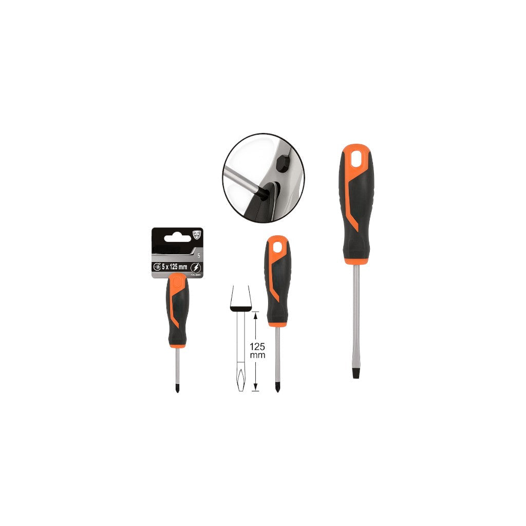 The Screwdriver (5×125 mm Flat/Slotted) is a durable, high-performance tool made from hardened CR-V steel with a precision blackened magnetic tip for secure fastening and accuracy, featuring a non-slip TPR handle and solid steel core for strength, comfort, and reliability in demanding tasks.