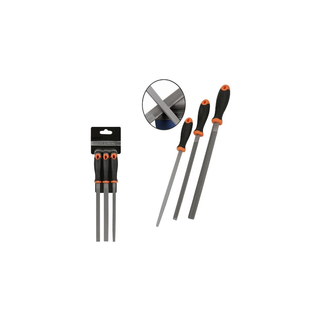 The Steel File Set (3-Piece) provides versatile performance for shaping, deburring, and finishing across metal, wood, and general materials. It includes flat, half-round, and round files with 200 mm T12 tool-grade blades and non-slip TPR bi-material handles for comfort, control, and long-lasting durability.