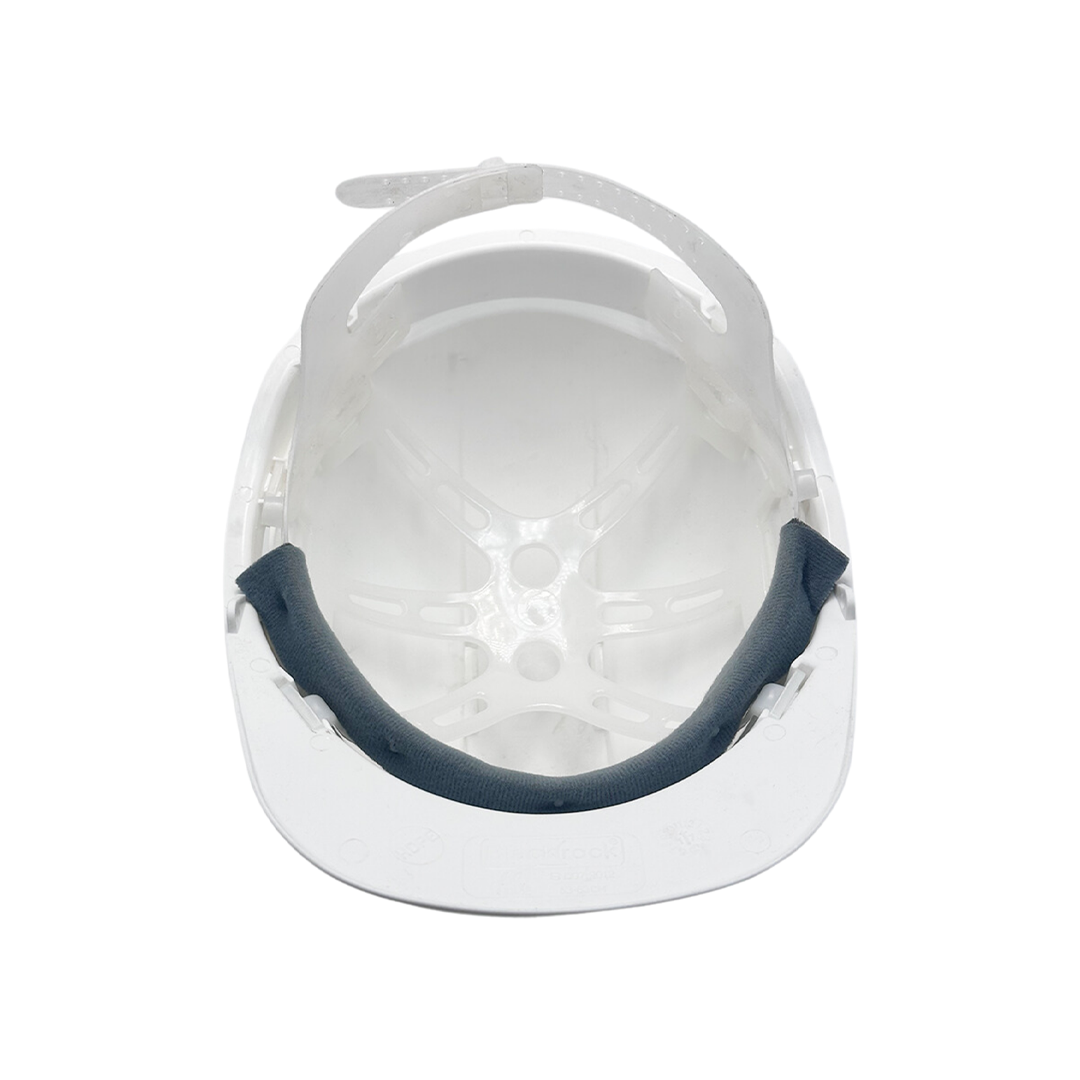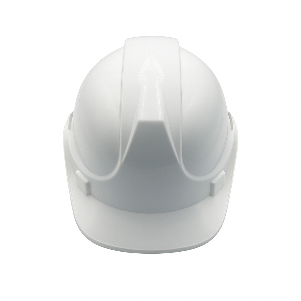 White safety helmet with a durable high-impact shell for reliable head protection, featuring a classic white design for a professional look and lightweight construction for all-day comfort.