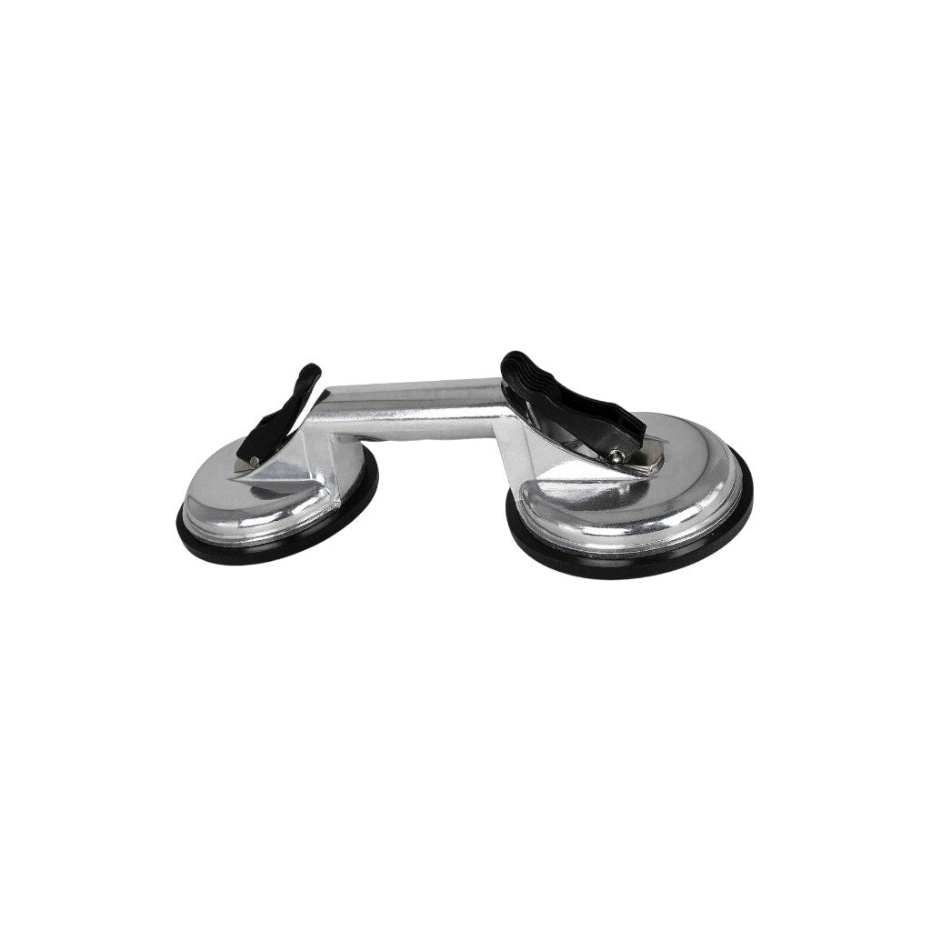 Double Pad Suction Lifter — A strong and reliable dual-cup lifter featuring 123 mm suction pads, designed for safely lifting, carrying, and positioning glass, metal, tiles, or other smooth, non-porous materials. With a load capacity of up to 100 kg, it provides a secure grip and easy operation, making it ideal for glazing, installation, and workshop use.