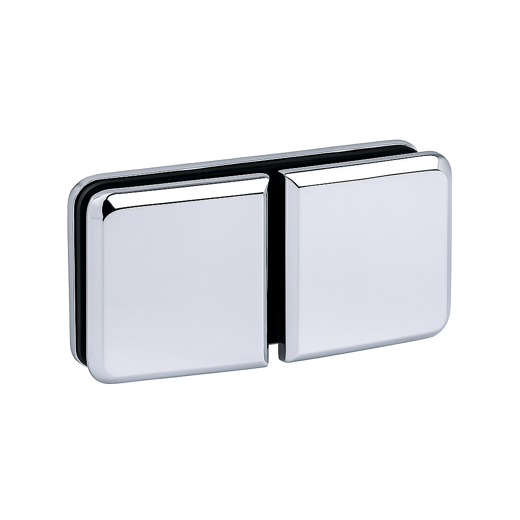 180° swing hinge for mounting a shower door to a fixed sidelight. Solid brass construction for durability. Suitable for 6–10 mm glass and doors up to 35 kg.