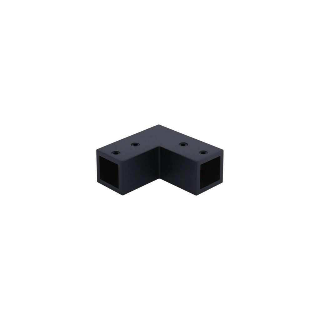 90° corner support bar connector made from durable stainless steel 304 and brass, featuring a matte black finish, designed for 15 mm square tubing with 1.5 mm wall thickness to join two stabilizer or support bars at a right angle—ideal for rigid shower frames and partitions; package includes 1 connector.