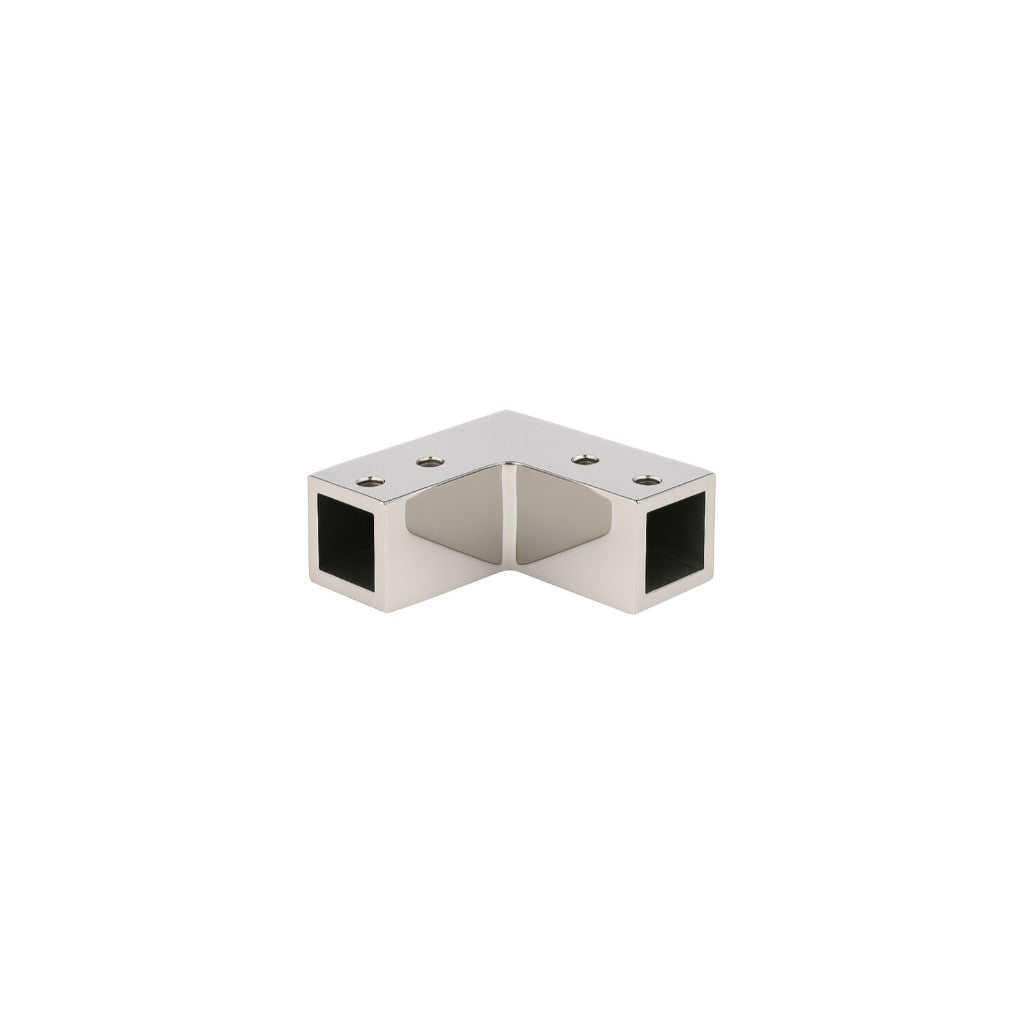 90° corner support bar connector made from durable stainless steel 304 and brass, featuring a polished nickel finish, designed for 15 mm square tubing with 1.5 mm wall thickness to join two stabilizer or support bars at a right angle—ideal for rigid shower frames and partitions; package includes 1 connector.