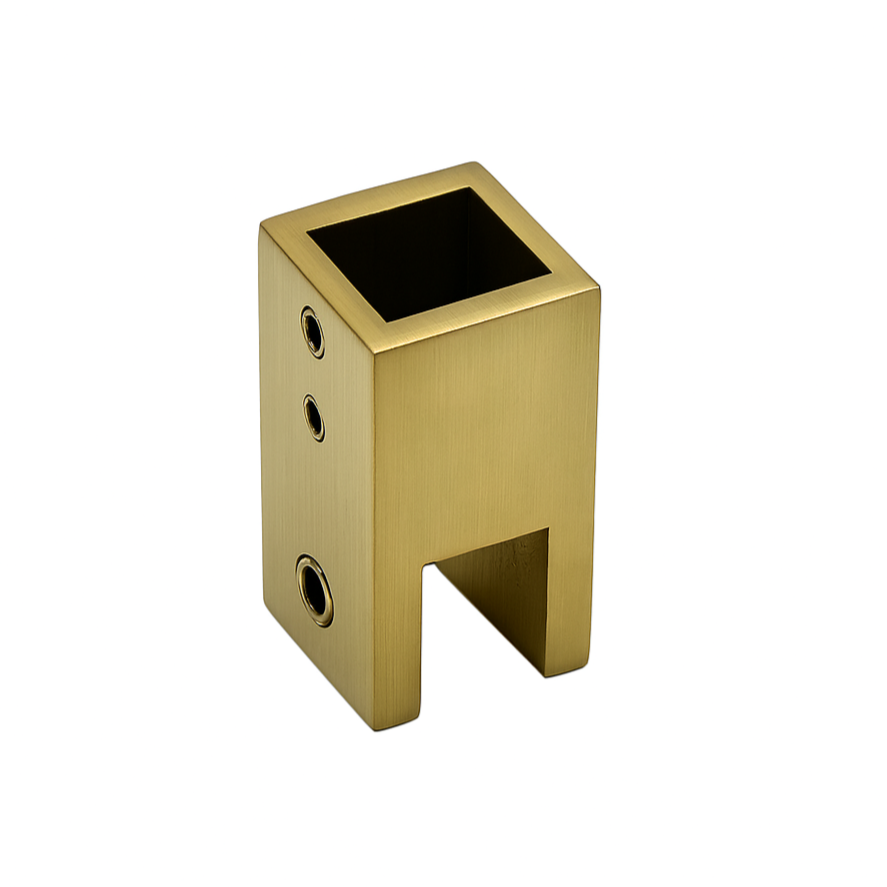 Glass-to-ceiling support bar connector made from durable stainless steel 304 and brass, featuring a brushed gold finish, designed to secure a 19 mm stabilizer or support bar from glass to ceiling in frameless shower enclosures for reliable anchoring and stabilization.