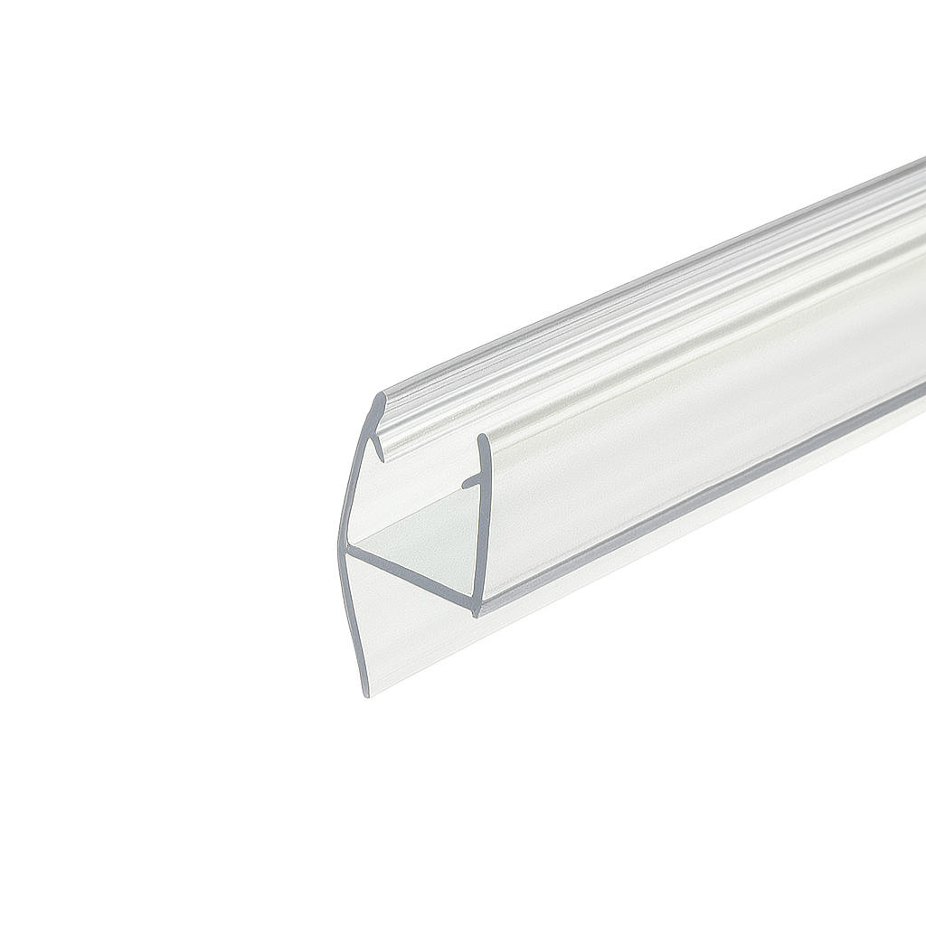 Snap-on bottom seal for frameless shower doors. H-profile with a soft leg (wipe fin) to help block water at the threshold—no drilling required.