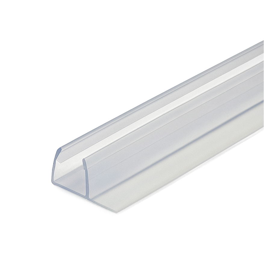 Snap-on bottom seal for frameless shower doors. F-profile with a soft leg (wipe fin) that helps deflect water back into the enclosure—no drilling required.