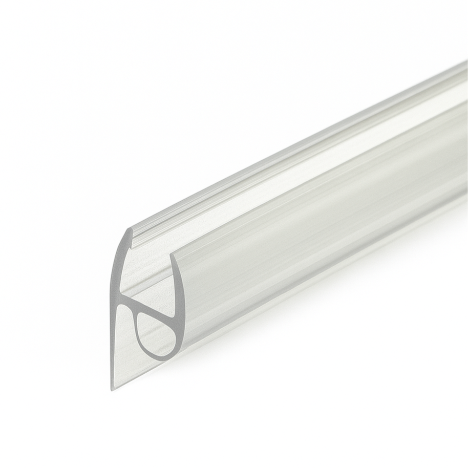 Snap-on bottom seal for frameless shower doors. Combines a small bubble (bulb) gasket for compression sealing with a flexible leg (wipe fin) to deflect water—no drilling required.