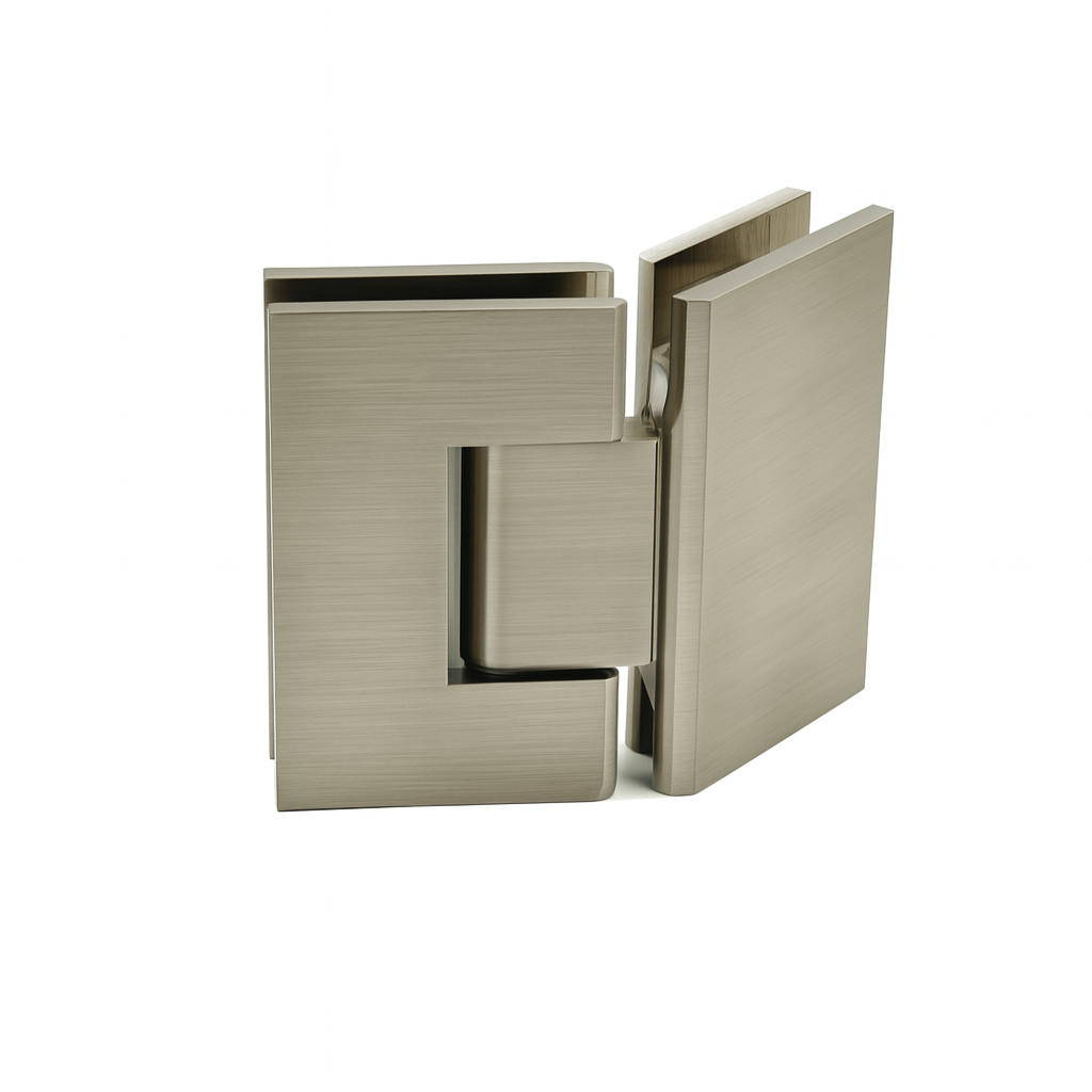 Glass-to-glass 135° swing shower door hinge has a load capacity of 35 kg. Designed for mounting doors to a fixed sidelight, it supports glass panels up to 0.75 x 2.10 m. The hinge ensures smooth operation with self-centering functionality when within 25° of closed position.