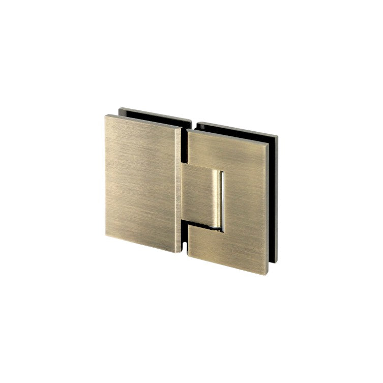 A sturdy brass hinge for 8–10mm glass doors (max 750mm width × 2100mm height, 35kg with 2 hinges), featuring 180° opening, self-centering close within 25°, glass-to-glass mounting, and each package includes 1 hinge, sold individually.