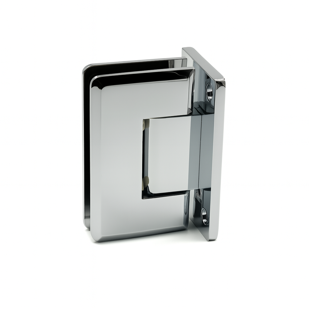Heavy-duty full-plate 90° hinge for mounting a shower door to a wall or fixed panel. Solid brass construction with smooth self-centering when the door is within 25° of closed. Rated for larger panels and 10–12 mm glass.
