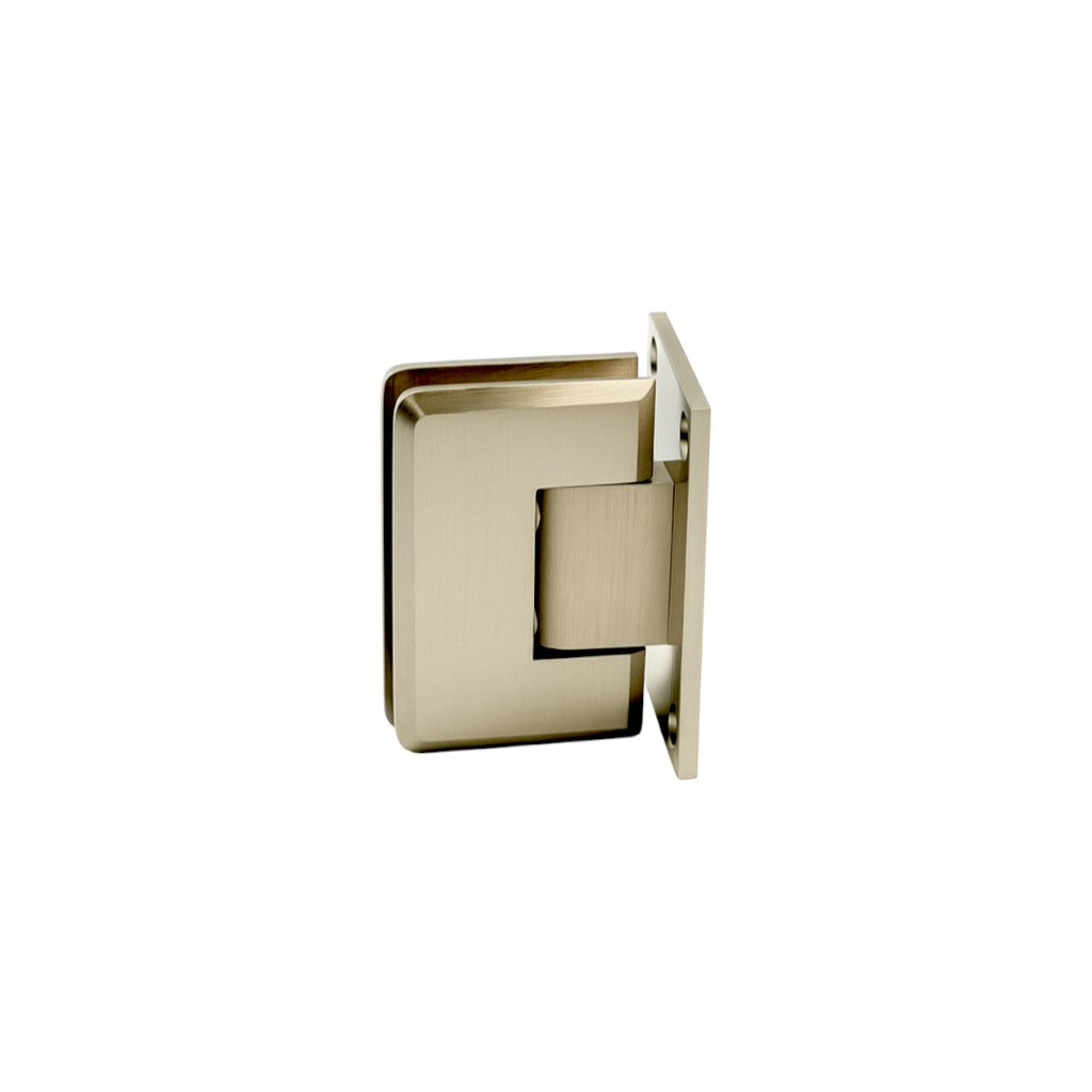 A solid brass hinge designed for mounting shower doors to walls or fixed panels. Featuring smooth self-centering within 25° of closed, it supports 6–8 mm glass panels up to 750 mm wide and 2100 mm high, with a maximum door weight of 35 kg (using two hinges).
