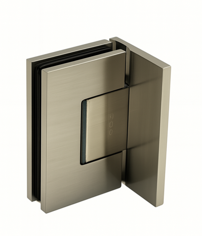 Offset-plate 90° hinge for mounting a shower door to a wall or fixed panel. Includes decorative cover lids with latch closures to conceal fasteners. Solid brass construction supports doors up to 45 kg (using two hinges) and glass panels up to 0.70 × 2.00 m.