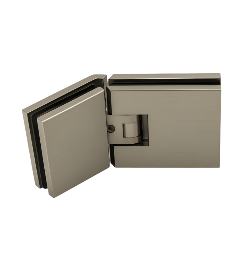 135° swing hinge for mounting a shower door to a fixed sidelight. Solid brass construction delivers smooth action with self-centering near the closed position.